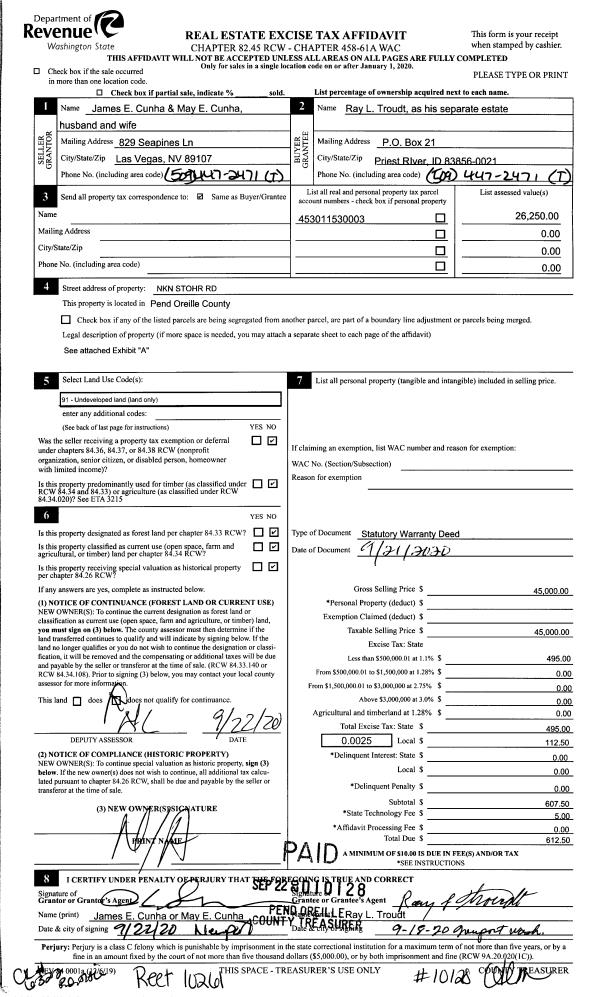 | 3 | 09/21/2020 | STATUTORY | Conv Doc Type | JAMES E CUNHA | RAY L TROUDT | | | $45,000.00 | 10128 | 20200340634 |