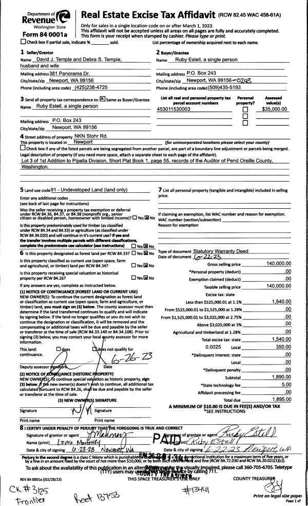 | 1 | 06/22/2023 | STATUTORY | Conv Doc Type | DAVID J AND DEBRA S TEMPLE | RUBY ESTELL | | | $140,000.00 | 13441 | 20230352896 |