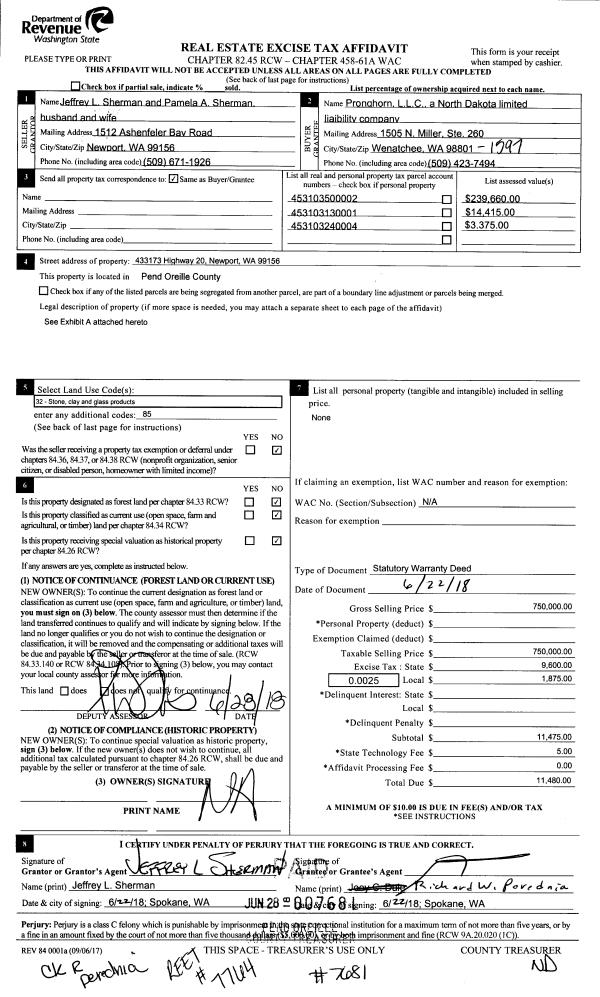 | 3 | 06/22/2018 | STATUTORY | Conv Doc Type | JEFFREY L SHERMAN | PRONGHORN LLC | | | $750,000.00 | 7681 | 20180331999 |