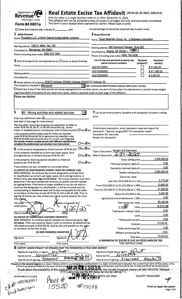 | 1 | 02/27/2025 | BARGAIN & | Conv Doc Type | PRONGHORN LLC | TEXAS MATERIALS GROUP INC | | | $3,205,063.00 | 15058 | 20250358272 |
