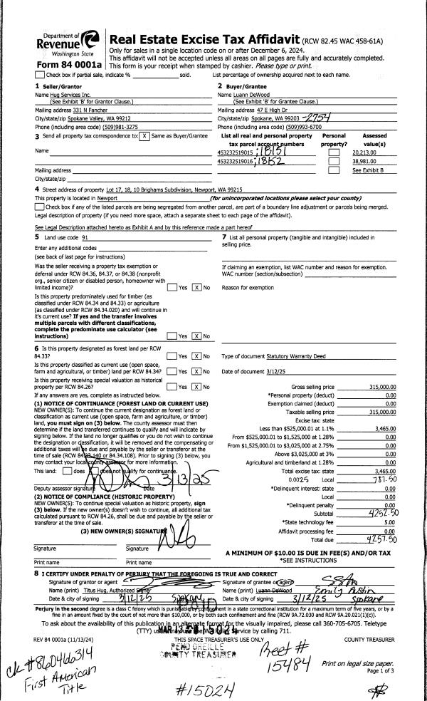 | 1 | 03/12/2025 | STATUTORY | Conv Doc Type | HUG SERVICES INC | LUANN DEWOOD | | | $315,000.00 | 15024 | 20250358172 |