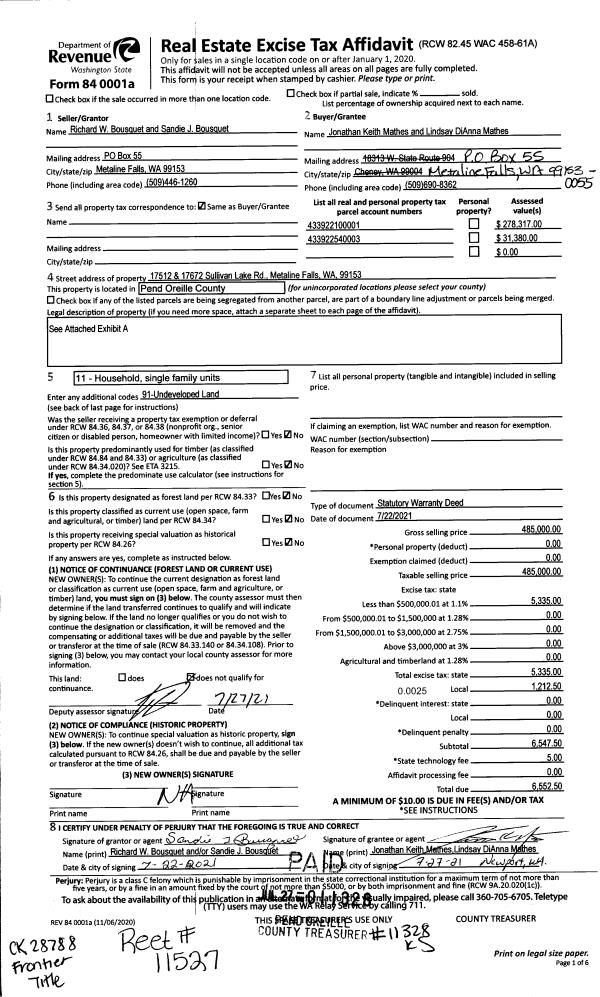 | 1 | 07/22/2021 | STATUTORY | Conv Doc Type | RICHARD W BOUSQUET | JONATHAN KEITH MATHES | | | $485,000.00 | 11328 | 20210345321 |