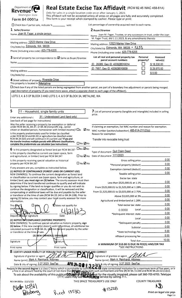 | 2 | 01/11/2023 | QUIT CLAIM | Conv Doc Type | JOAN M FAGER | JOAN M FAGER TRUST | | | $0.00 | 13228 | 20230352296 |