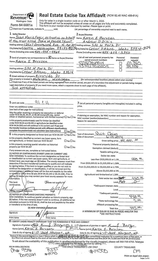 | 1 | 06/14/2024 | QUIT CLAIM | Conv Doc Type | JOAN M FAGER TRUST | KAREN E BOROZAN | | | $40,000.00 | 14355 | 20240355867 |